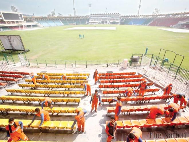 لاہور : ورلڈ الیون کیخلاف سیریز کیلئے قذافی اسٹیڈیم لاہور میں ہنگامی بنیاد پرتیاریوں کا آغازکردیا گیا ہے۔ پاکستان کرکٹ بورڈ کا انتظامی اسٹاف متعلقہ شعبوں میں اپنی اپنی ذمہ داریاں سنبھالنے کے بعد انتظامات کوحتمی شکل دینے کیلئے سرگرم ہے۔کرسیوں پر نیا رنگ و روغن کیا جارہا ہے۔ جہاں پر تجدید اورمرمت کی ضرورت ہے وہاں خوشنما طریقے سے کام پایہ تکمیل تک پہنچایا جا رہا ہے۔پی سی بی کا اسٹاف اپنی تما م امور کی نگرانی کر رہا ہے۔ میدان میں موجود فاضل گھاس کو صاف کروا کے خوشنما بنانے کا سلسلہ چند روز قبل ہی شروع کردیا گیا،3 ٹی ٹوئنٹی میچز کیلئے کم از کم 4پچز تیار کی جائیں گی۔