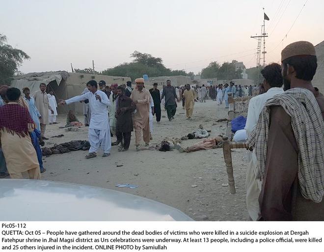 کوئٹہ ... بلوچستان کے ضلع جھل مگسی میں خودکش دھماکے میں جاں بحق ہونے والوں کی تعداد20 ہوگئی۔ زخمیوں میں کئی کی حالت نازک ہے۔ جمعرات کی رات ضلع جھل مگسی کے علاقے گنداوا میں مقبرہ میر فتح پور پر خودکش حملہ ہوا ۔ خودکش بمبار اندر داخل ہونے کی کوشش کررہا تھا کہ گیٹ پر تعینات سیکیورٹی اہلکاروں نے اسے روکنے کی کوشش کی جس پر اس نے گیٹ پر ہی دھماکہ کردیا ۔صوبائی وزیر داخلہ میر سرفراز بگٹی نے کہا کہ خودکش حملے میں سجادہ نشین محفوظ رہے۔ ڈیرہ مراد جمالی ،سبی ،جھل مگسی سے امدادی ٹیمیں جائے وقوعہ پر پہنچی ہیں ۔حکومت بلوچستان کے ترجمان انوارالحق کاکڑ نے بتایا کہ جمعرات کو رش ہونے کے باعث لوگوں کی بڑی تعداد موجود تھی ۔پولیس نے خودکش حملہ آور کو روکنے کی کوشش کی ۔ تمام اسپتالوں میں ایمر جنسی نافذ کر دی گئی۔شدید زخمیوں کو لاڑکانہ سمیت دیگر علاقوں کے لئے منتقل کر دیا گیا ۔ ترجمان نے کہا کہ دہشتگرد ایک منصوبے کے تحت بے گنا ہ لوگوں کو نشانہ بنا رہے ہیں۔ ملک دشمن عناصر قوتوں کو کسی بھی صور ت معاف نہیں کیا جائیگا۔ صوبائی حکومت اور ان کے ادارے دہشتگردوں کے خلاف پرعزم ہیں۔ان کے تمام عزائم کو ناکام بنائیں گے ۔