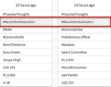 منگل کے دن ہیش ٹیگ #ریزولیوشن_کا_سولیوشن انڈیا میں دوسرے نمبر پر جبکہ عالمی ٹرینڈ میں26ویں نمبر پر رہاجس میں صارفین نے نئے سال میں اپنے ارادسے آگاہ کیا۔