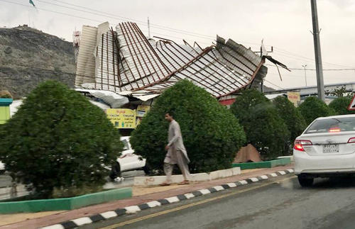 عسیر .... محایل عسیر کمشنری میں جمعہ کو آنے والی ِآندھی کے بعد صناعیہ کے علاقے میں ورکشاپوں کے ٹین گرگئے۔ ایک پاکستانی متاثرہ جگہ سے گزر رہا ہے۔ آندھی اتنی تیز تھی کہ بجلی کے کھمبے بھی گر گئے۔ موسلا دھار بارش کے باعث وادیاں پانی سے بھر گئیں۔ پورے علاقے کا موسم خوشگوار ہوگیا۔
