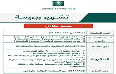 ریاض۔۔۔۔سعودی وزارت تجارت و سرمایہ کاری نے اعلان کیا ہے کہ ایک سعودی شہری مصر کے 3شہریوں محمد مہدی غنیم، علا عویس اور فرید لاشین کو اسٹیشنری ،اسکول کے لوازمات اور لیباریٹریوں کا کاروبار اپنے نام سے کرارہا تھا۔ مقامی شہری عبداللہ الصانع کے خلاف مذکورہ الزام ثابت ہوجانے پر ریاض کی فوجداری کی عدالت نے سزا سنا دی۔تفصیلات کے مطابق ایک لاکھ ریال جرمانہ ، دکانیں سربمہر کرنے، سجل تجاری سلب کرنے ، آئندہ مذکورہ کاروبار کی ممانعت ، مصریوں کو جرمانے اور سزا کانٹنے کی بعد مملکت سے بیدخل کرنے اور دوبارہ کاروبار پر پابندی کا فیصلہ سنایا گیا ۔ یہ بھی طے کیا گیا کہ تینوں غیر ملکیوں اور سعودی شہری کے حوالے سے فوجداری کے عدالت کے فیصلے کو ان کے خرچ پر مقامی اخبار میں شائع کیا جائے۔