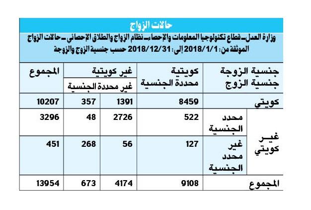 اسی طرح کویتی شہریوں نے غیر متعین شہریت کی حامل لڑکیوں سے شادی کرنے والوں کی تعداد357 اور طلاقیں142رہیں۔ اس کے بالمقابل 522کویتی لڑکیوں نے دیگر ممالک سے تعلق رکھنے والے نوجوانوں سے شادیاں کیں جبکہ طلاقوں کی شرح 469 رہی۔ کویت میں مقیم غیر ملکیوں میں شادیوں کی شرح 2726رہی جبکہ طلاق کی شرح 1301رہی۔