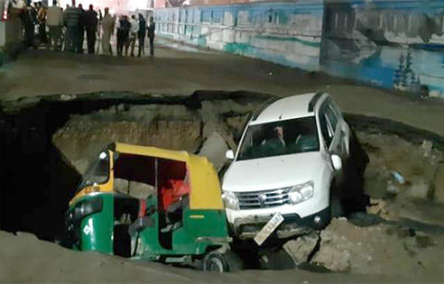 نئی دہلی۔۔۔۔شمال مشرقی دہلی کے موجپور میٹرو اسٹیشن کے قریب جمنا ویہار کی طرف جانے والی سڑک سیور لائن پھٹنے سے کئی فٹ دھنس گئی جس میں ایک کار اور آٹو رکشہ جاگرا۔اطلاع ملتے ہی پولیس اور امدادی ٹیمیں جائے وقوعہ پر پہنچ کر کار اور آٹو رکشہ کو نکالنے کی کارروائی شروع کردی۔پولیس ذرائع کے مطابق حادثے میں کوئی جانی نقصان نہیں ہوا۔عینی شاہد ورون نے بتایا سیور لائن پھٹنے سے سڑک اچانک دھنسنے لگی اور دیکھتے ہی دیکھتے 6فٹ طویل گہرا گڑھا پیدا ہوگیااسی دوران عقب سے آنے والی کار اور آٹو رکشہ اس میں گرگیا۔ بعد ازاں ٹریفک اژدہام پیدا ہوگیا اور سڑک پر گاڑیوں کی لمبی قطاریں لگ گئیں۔اطلاع کے مطابق سیورلائن پھٹنے سے سڑک تالاب میں تبدیل ہوگئی اور گڑھا خطرناک شکل اختیار کرگیا۔پولیس نے پورے علاقے میں گاڑیوں کی آمدورفت بند کردی۔مقامی رکن اسمبلی نے موقع پر پہنچ کر مورچہ سنبھالا اور ٹریفک نظام بحال کرنے کی بھرپور کوشش کی۔