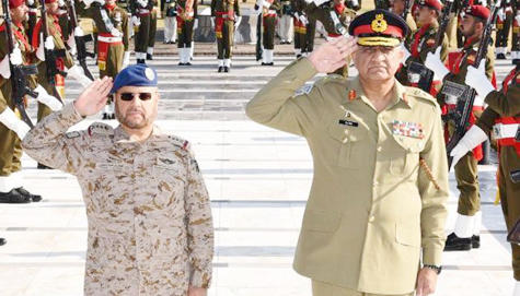 راولپنڈی: پاک فوج کے سپہ سالار جنرل قمر جاوید باجوہ سے سعودی رائل آرمی کے چیف آف جنرل اسٹاف جنرل فاید بن حمد نے ملاقات کی جس میں جیو اسٹراٹیجک صورت حال پر تبادلہ خیال کیا گیا۔ پاک فوج کے شعبہ تعلقات عامہ آئی ایس پی آر کے مطابق ملاقات میں جنرل قمر جاوید باجوہ نے کہا کہ پاک فوج رائل سعودی آرمی سے بھرپور تعاون کو اپنی ذمہ داری سمجھتی ہے ۔ آرمی چیف جنرل قمر جاوید باجوہ سے رائل سعودی آرمی کے وفد نے ملاقات کی اور اس موقع پر سعودی جنرل نے رائل سعودی آرمی کو تربیت دینے پر پاک فوج کا شکریہ ادا کیا۔ آئی ایس پی آر کے مطابق ملاقات میں دو طرفہ دفاعی تعاون سے متعلق امور پر بھی تبادلہ خیال کیا گیا۔ سعودی جنرل نے رائل سعودی آرمی کو تربیت دینے پر پاک فوج کا شکریہ ادا کیا۔ سعودی چیف آف جنرل اسٹاف نے پاک فوج کے اعلیٰ پیشہ ورانہ معیار کو تسلیم کیا۔ آرمی چیف جنرل قمر جاوید باجوہ نے سعودی چیف آف جنرل اسٹاف کے پاک فوج کے متعلق خیالات پر ان کا شکریہ ادا کیا۔ سعودی چیف آف جنرل اسٹاف کو جنرل ہیڈکوارٹرز (جی ایچ کیو) میں گارڈ آف آنر دیا گیا۔