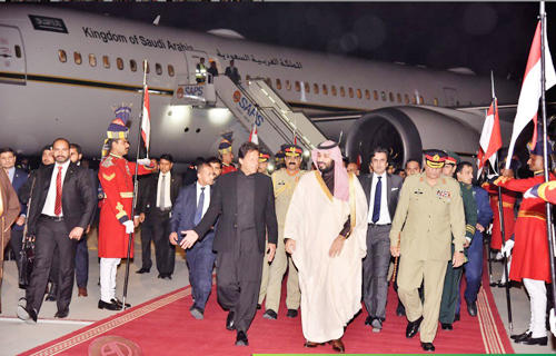 اسلام آباد(وسیم عباسی)سعودی ولی عہد شہزادہ محمد بن سلمان پاکستان کے2روزہ دورے پر اسلام آباد پہنچ گئے ہیں۔ نور خان ایئربیس پر وزیراعظم عمران خان نے اپنی کابینہ کے ہمراہ معزز مہمان کا استقبال کیا۔ قبل ازیں جب ان کا طیارہ پاکستان کی فضائی حدود میں داخل ہوا تو پاک فضائیہ کے طیاروں نے اسے حفاظتی تحویل میں لے لیا۔ ایئربیس پر انہیں21 توپوں کی سلامی دی گئی اور گارڈ آف آنر پیش کیا گیا۔ ان کی آج شام وزیراعظم عمران خان سے ملاقات ہو گی جس کے بعد ان کے اعزاز میں عشائیہ دیا جا ئے گا۔ سعودی کابینہ کے ارکان، اعلی حکومتی عہدیداران اور ممتاز سعودی کمپنیوں کے سربراہان بھی شہزادہ محمد بن سلمان کے ہمراہ پاکستان پہنچے ہیں۔ محمد بن سلمان کا بطور ولی عہد پہلا دورہپاکستان ہے جس میں وہ صدر مملکت اور آرمی چیف سے بھی ملاقاتیں کریں گے جبکہ دورے کے موقع پر سکیورٹی کے سخت انتظامات کیے گئے ہیں۔ اسلام آباد میں پیر کو عام تعطیل کا اعلان کیا گیا ہے جبکہ تمام اہم شاہراوں اور پارلیمنٹ ہاوس کو بڑے بڑے خیرمقدمی بینرز سے سجایا گیا ہے۔ موجودہ معاشی حالات اور خطے کی صورتحال کے تناظر میں سعودی ولی عہد کے دو روزہ دورے کو انتہائی اہمیت کا حامل قرار دیا جا رہا ہے۔ حکام کا کہنا ہے کہ شہزادہ محمد بن سلمان کے اس دورے کے دوران گوادار میں آئل ریفائنری کے قیام، سمیت مفاہمت کی 8 یادداشتوں پر دستخط کئے جائیں گے اور طے پانے والے سمجھوتوں کے نتیجے میں تقریباً10 ارب ڈالر کی سرمایہ کاری متوقع ہے۔