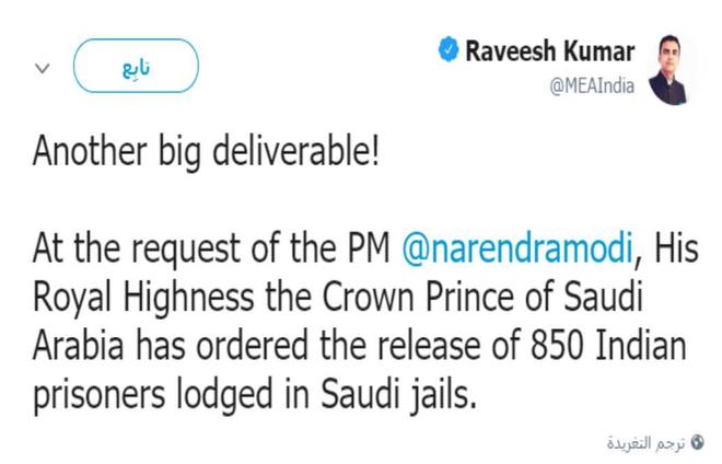 At the request of the PM @narendramodi, His Royal Highness the Crown Prince of Saudi Arabia has ordered the release of 850 Indian prisoners lodged in Saudi jails. pic.twitter.com/jIVTCbIRLa— Raveesh Kumar (@MEAIndia) ٢٠ فبراير ٢٠١٩