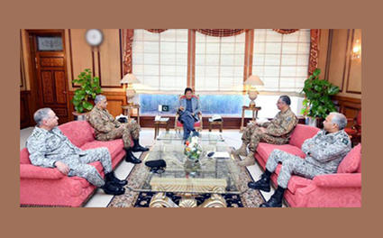 اسلام آباد...وزیراعظم عمران خان سے چیئرمین جوائنٹ چیفس آف اسٹاف کمیٹی اور سروسز چیفس نے ملاقات کی ۔ملک کی سیکیورٹی صورتحال اور پیشہ وارانہ امور پر بات کی گئی۔ بدھ کو وزیراعظم آفس میں چیئرمین جوائنٹ چیفس آسٹاف سمیت تینوں مسلح افواج کے سربراہان آرمی چیف جنرل قمر جاوید باجوہ، ایئرچیف مجاہد انور خان اور ایڈمرل ظفر محمود عباسی نے ملاقات کی ۔ سروسز چیفس نے وزیراعظم کو ملک کی زمینی، فضائی اور بحری بارڈر کی صورتحال سے آگاہ کیا۔ پاک فوج کی صلاحیت اور تیاریوں سے متعلق بھی تفصیلی بریفنگ دی گئی۔ عمران خان نے پاکستان اور ہند کے درمیان حالیہ کشیدگی کے دوران پاک فوج خاص طور پر پاکستان فضائیہ کی کارکردگی کی تعریف کی۔