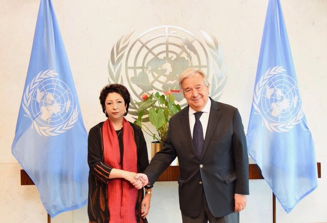 ملیحہ لودھی نے اقوام متحدہ کے سیکرٹری جنرل کے ساتھ ملاقات میں کہا کہ اقوام متحدہ کو قانون اور انسانی حقوق کی بالادستی کے لیے آواز اٹھانا ہو گی۔ فوٹو اے ایف پی