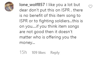 لون ولف نام کے ایک صارف نے لکھا کہ انہیں نیلم منیر بہت پسند ہیں مگر انہیں ایسے فیصلے آئی ایس پی آر پر نہیں ڈالنے چاہیے کیونکہ ایسے گانوں سے آئی ایس پی آر کو کوئی فائدہ نہیں۔