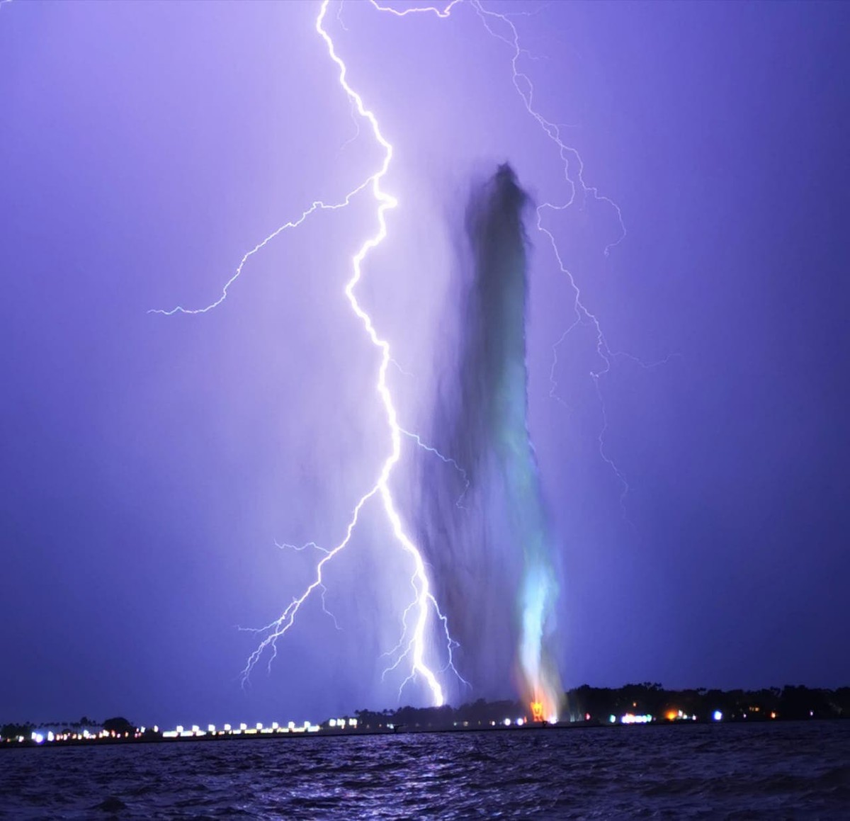 انہوں نے کہا ہے کہ ’رات 9 بجے آسمان پر بادلوں کی گرج اور بجلی کی چمک شروع ہوگئی تھی۔ میں فوارے کے قریب تصاویر لینے کے لیے بیٹھ گیا۔ اگلے چند لمحات میں میری خواہش پوری ہوگئی‘۔
