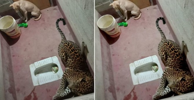 انڈین فارسٹ سروس کے آفیسر پروین کسوان نے باتھ روم میں بند کتے اور چیتے کی تصویر ٹوئٹر پر پوسٹ کی جس میں دیکھا جا سکتا ہے دونوں جانور ایک دوسرے سے چند فٹ کے فاصلے پر غسل خانے کے کونوں میں بے چین بیٹھے ہیں۔