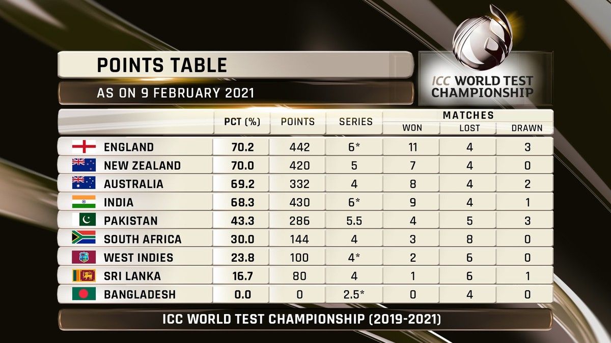 ٹیسٹ کرکٹ کھیلنے والی نو ٹیموں میں اب تک کی صورت حال کے مطابق انگلینڈ 442 پوائنٹس کے ساتھ پہلے، نیوزی لینڈ 420 پوائنٹس کے ساتھ دوسرے، آسٹریلیا 332 پوائنٹ کے ساتھ تیسرے جب کہ انڈیا 430 پوائنٹس کے ساتھ چوتھے نمبر پر ہے۔