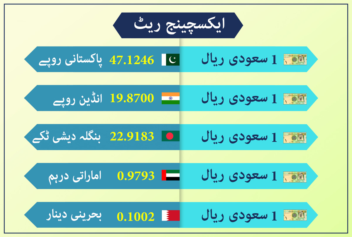 سعودی عرب کے مختلف ٹرانزیکشن مراکز کے مطابق منگل کو سعودی ریال کا ریٹ کچھ یوں رہا ہے۔