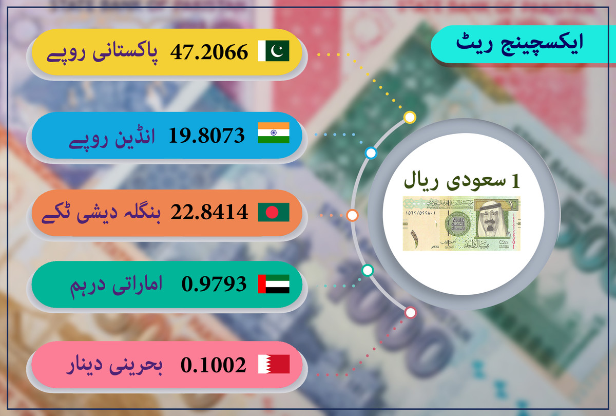 سعودی عرب کے مختلف ٹرانزیکشن مراکز کے مطابق ہفتہ کو سعودی ریال کا ریٹ کچھ یوں رہا ہے۔