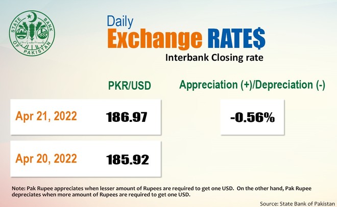 سٹیٹ بینک آف پاکستان کے مطابق جمعرات کو روپے کے مقابلے میں ڈالر کی قیمت میں 1.05 روپے کا اضافہ ہوا ہے اور اس اضافے کے بعد اس کی نئی قیمت 186.97 روپے ہوگئی ہے۔