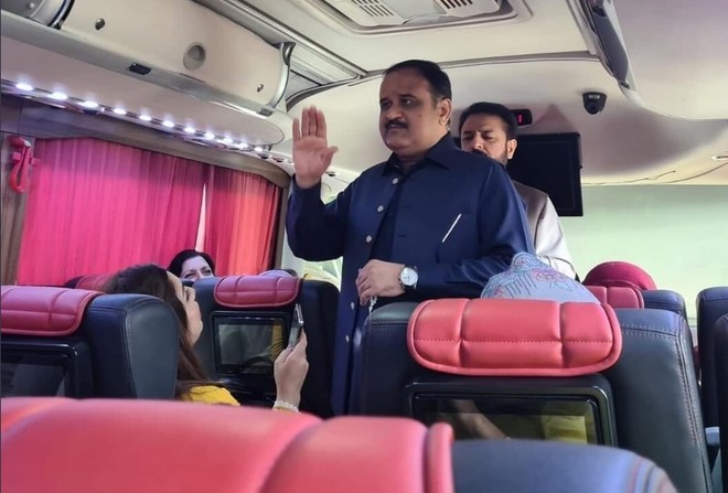 پہلے منظر میں سابق وزیراعلی پنجاب عثمان بزدار بس میں موجود تحریک انصاف کی خواتین ارکان اسمبلی کے درمیان کھڑے دکھائی دیے۔