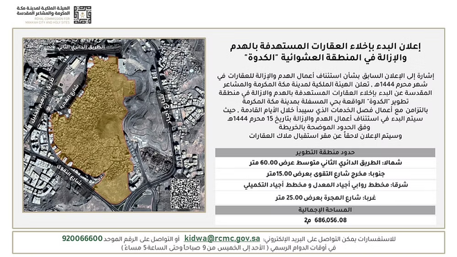 مکہ مکرمہ رایل اتھارٹی نے کہا ہے کہ مسفلہ میں کدوہ محلے کو گرانے کے لیے رہائشیوں کو مکانات خالی کرنے کا حتمی نوٹس جاری کر دیا گیا ہے۔