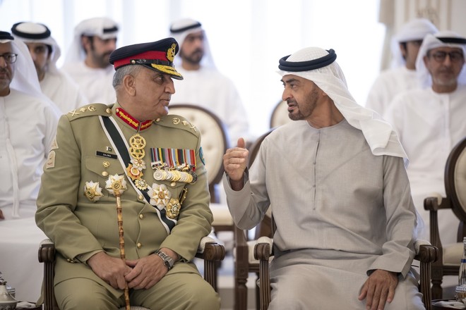 شیخ محمد بن زاید آل نہیان نے دونوں دوست ملکوں کے درمیان مشترکہ تعاون کی جڑیں گہری کرنے کے سلسلے میں موثر کردار ادا کرنے اور تعلقات کو مضبوط بنانے کے سلسلے میں منفرد کوششوں کے اعتراف میں جنرل قمر جاوید باجوہ کو ’وسام الاتحاد‘ اعزاز سے نوازا۔