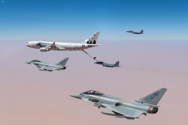 تصاویر میں دیکھا جاسکتا ہے کہ ایف 15 ایس آئی، ٹایفون اور ایف 15 سی ساختہ چھ سعودی لڑاکا طیارے امریکی بمبار بی 52 کو اپنے حصار میں لیے ہوئے ہیں۔