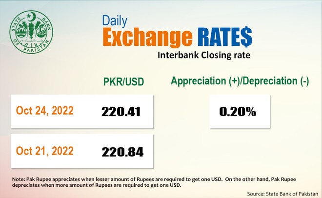 پیر کو کاروباری ہفتے کے پہلے روز انٹربینک مارکیٹ میں روپے کی قدر میں 43 پیسے کا اضافہ ہوا جس کے بعد امریکی ڈالر کی نئی قیمت 220.41 روپے رہی۔
