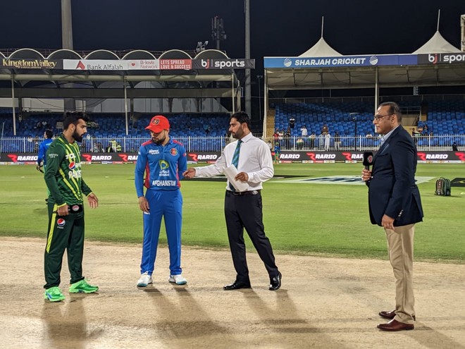 پاکستان کی جانب سے صائم ایوب اور محمد حارث نے اننگز کا آغاز کیا لیکن حارث جو افغان فاسٹ بولرز کے سامنے جدوجہد کرتے نظر آئے، صرف چھ رنز بنا کر پویلین روانہ ہو گئے۔ انہیں فضل الحق فاروقی نے آؤٹ کیا۔