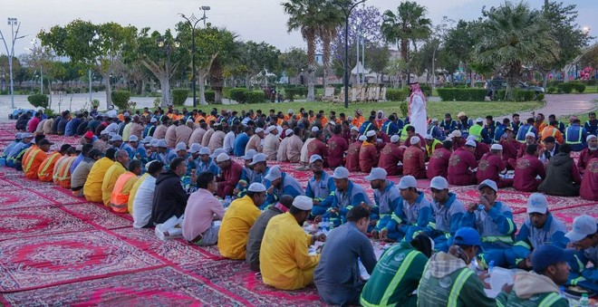 سعودی عرب میں طائف میونسپلٹی نے النسیم علاقے میں واقع کنگ عبداللہ پارک میں 500 سے زیادہ صفائی کارکنوں کے لیے افطار دسترخوان سجایا گیا ہے۔