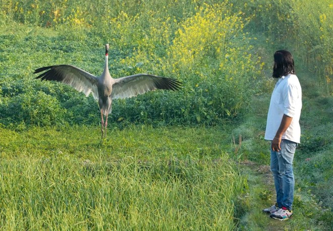 عارف خان گزشتہ برس فروری میں ایک زخمی سارس اپنے ساتھ گھر لائے تھے جو انہیں کھیت میں زخمی حالت میں پڑا ملا تھا۔ (فوٹو: پریس ٹرسٹ آف انڈیا)