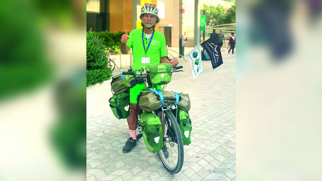 جرمن سیاح مائیکل ایورٹس سائیکل پر سات ماہ کے طویل سفر کے بعد برلن سے دبئی پہنچ گئے۔