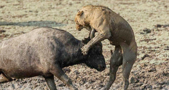 ساﺅتھ لوانگوا ، زمبیا.... برطانوی وائلڈ لائف فوٹو گرافر لیوک میسے نے جو یہاں جنگلی ماحولیات اور جانوروں کی تصاویر اتارنے کے مشن پر آئے ہوئے ہیں مقامی پارک کی سیر کے دوران ایک عجیب و غریب منظر دیکھا۔ جس میں ایک شیر اور بیل آپس میں لڑتے نظرآئے۔ دونوں کی لڑائی دیکھ کر فوٹو گرافر کو سخت حیرت ہوئی اور اس نے موقع ضائع کئے بغیر اسکی تصویر اتار کر محفوظ کرلی جو بعد میں نیٹ پر جاری ہوگئی۔ میسے کا کہناہے کہ لڑائی کے دوران ایک وقت ایسا بھی آیا کہ جب وہ شیر کے پیٹ میں اپنے نوکیلے سینگ باآسانی گھونپ سکتا تھا اور یہ حملہ شیر کیلئے جان لیوا ثابت ہوتا مگر آس پاس میں موجود دوسرے بہت سارے شیر بھی بیل سے لڑنے کیلئے آگئے۔ وہ سب بیل کے ساتھ لڑائی میں شریک تو نہیں ہوئے مگر انکی آمد سے لڑنے والے شیر کی حوصلہ افزائی ضرور ہوئی اور یوں بیل ہمت ہارنے کے بعد اپنی جان گنوا بیٹھا۔ صورتحال دیکھ کر لڑائی کے آخری مراحل میں کچھ بیل بھی اپنے ہم جنس کی مدد کو پہنچے مگر انکی آمد میں کافی دیر ہوچکی تھی اور بیل اپنی جان سے جاچکا تھا۔