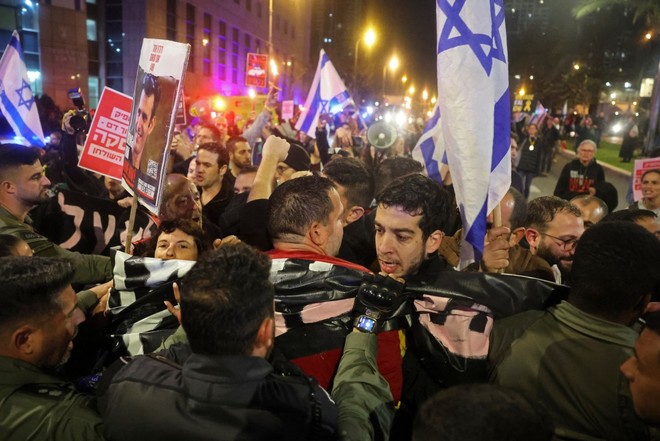 اس کے ساتھ ہی حکومت مخالف مظاہرین نے تل ابیب میں نیتن یاہو کی برطرفی کا مطالبہ کرتے ہوئے سڑکوں اور گلیوں کو بند کر رکھا تھا۔ مظاہرین کو منتشر کرنے کے لیے پولیس نے واٹر کینن کا استعمال کیا۔
