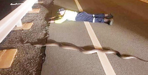 سڈنی .... ایک مقامی آسٹریلوی نوجوان نے اژدھے کو سڑک پار کرتے ہوئے دیکھا تو اس نے وہ کچھ کیا جو ہم نہیں کرسکتے یعنی وہ اس اژدھے کے قریب ہی لیٹ گیا۔ میتھیو بیگر اس وقت تک سڑک پر لیٹا رہا جب تک اژدھے نے سڑک پار نہیں کرلی۔اسکی یہ تصویر فیس بک پر ڈالدی گئی ہے جو ایک شخص نے دور سے اتاری تھی۔ یہ اژدھا نایاب نسل کا ہے اور کبھی کبھار ہی نظر آتا ہے۔ عام طور پر یہ سڑک بڑی مصروف رہتی ہے لیکن اس پر ٹریفک کم تھا۔