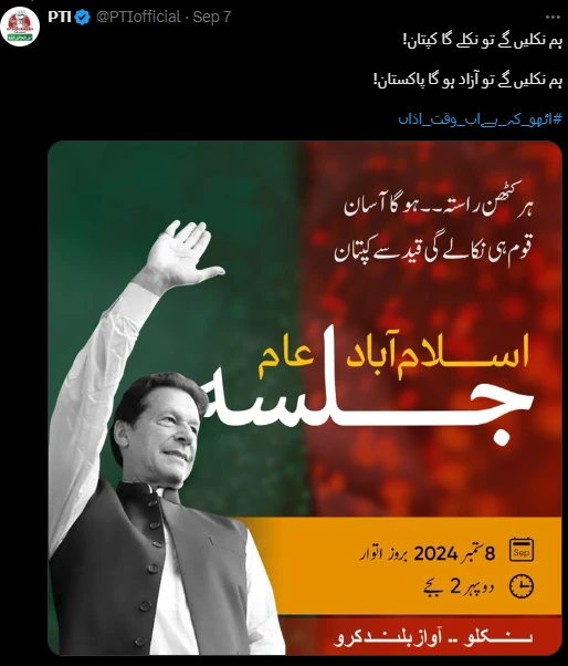 یاد رہے کہ پاکستان تحریک انصاف نے ضلعی انتظامیہ کی جانب سے این او سی منسوخ کیے جانے کے باوجود ہر صورت 22 اگست کو جلسہ کرنے کا اعلان کیا تھا تاہم یہ جلسہ ملتوی کر دیا گیا۔ پارٹی چیئرمین بیرسٹر گوہر نے اعلان کیا تھا کہ جلسہ اب آئندہ ماہ 8 ستمبر کو ہو گا۔