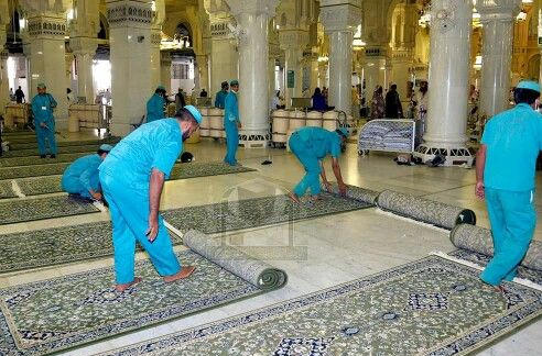 مدینہ منورہ ( وا س) مسجد الحرام کی انتظامیہ نے عید الفطر کے بعد آنیوالے پہلے جمعہ کو مسجد الحرام میں 3100سے زیادہ نئے قالین بچھوائے ۔ تمام قالینوں کو بچھانے سے پہلے معطر کیا گیا ۔ شاہ فہدرحمت اللہ علیہ کے توسیعی حصے میں زمینی اور پہلی منزل کے قالین تبدیل کئے گئے ۔