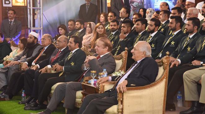 اسلام آباد...چمپیئنز ٹرافی کی فاتح قومی ٹیم کو منگل کو وزیر اعظم ہاوس میں استقبالیہ دیا گیا۔ ٹیم کا شاندار استقبال کیا گیا۔وزیراعظم نواز شریف اور ان کی اہلیہ نے ٹیم کا خیر مقدم کیا۔ اس موقع پر وفاقی وزراءکے ساتھ غیر ملکی سفراء، سینیٹ اور قومی اسمبلی کے اپوزیشن لیڈرز ،پی سی بی کے چیئرمین شہریار خان، چیف سلیکٹر انضمام الحق، ایگزیکٹو کمیٹی کے سربراہ نجم سیٹھی سابق کرکٹرز اور گورننگ بورڈ کے ارکان بھی موجود تھے۔اڈ میں شامل کھلاڑیوں کو وزیر اعظم کی طرف سے اعلان کردہ ایک ایک کروڑروپے د ئیے جائیں گے۔