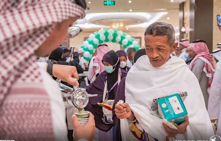 عازمین حج کا سعودی قہوے، کھجوروں اور پھولوں سے استقبال