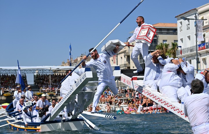 فرانس کی گرینڈ کنال میں ملاحوں کے درمیان نیزہ بازی کا مقابلہ